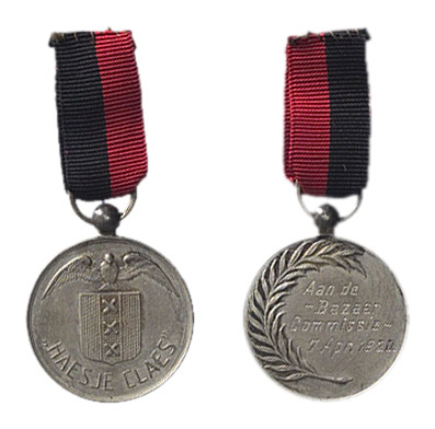 Draagpenning van Haesje Claes, Vereniging van oud-burgerwezen, gegeven aan de Bazaarcommissieleden, bij het 400-jarig bestaan van het Burgerweeshuis, 1920