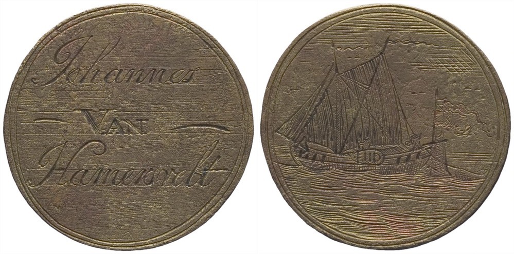 voorzijde: in een dubbele cirkelgroef een naar links varend zeilschip met één mast en een vlag met het wapen van Amsterdam op de achtersteven. Daarachter aan een touw een sloepje.