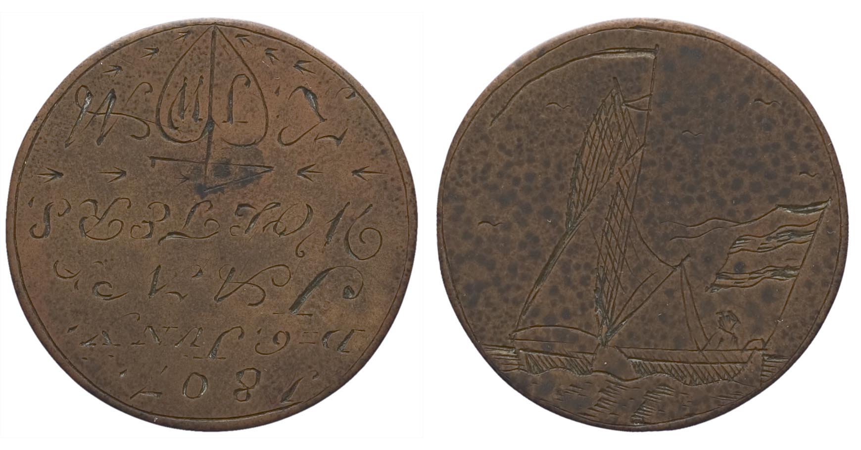 voorzijde: in cirkelgroef, een naar links varend zeilschip met één mast met vaandel naar links. Achterin een schipper aan het roer en een vlag wapperend naar links.