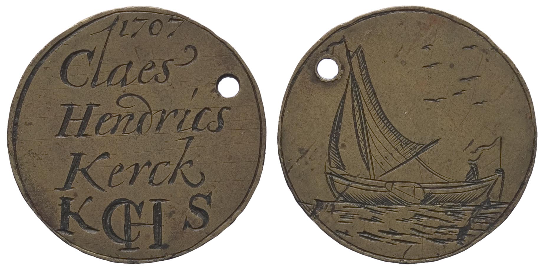 voorzijde: in cirkelgroef, een naar links varend zeilschip met één mast met vaandel naar links. Achterin een schipper aan het roer en een vaandel wapperend naar links. Meeuwen in de lucht. Linksboven doorboord.