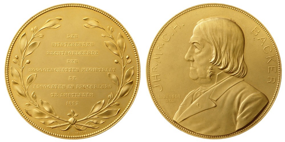 Ter gelegenheid van zijn aftreden als president van de Rechtbank te Amsterdam, welke functie hij van 1876 tot 1892 had vervuld, kreeg Jhr. Mr. Cornelis H. Backer een penning met zijn portret aangeboden door de advocaten en procureurs. ( Judith van Gent)