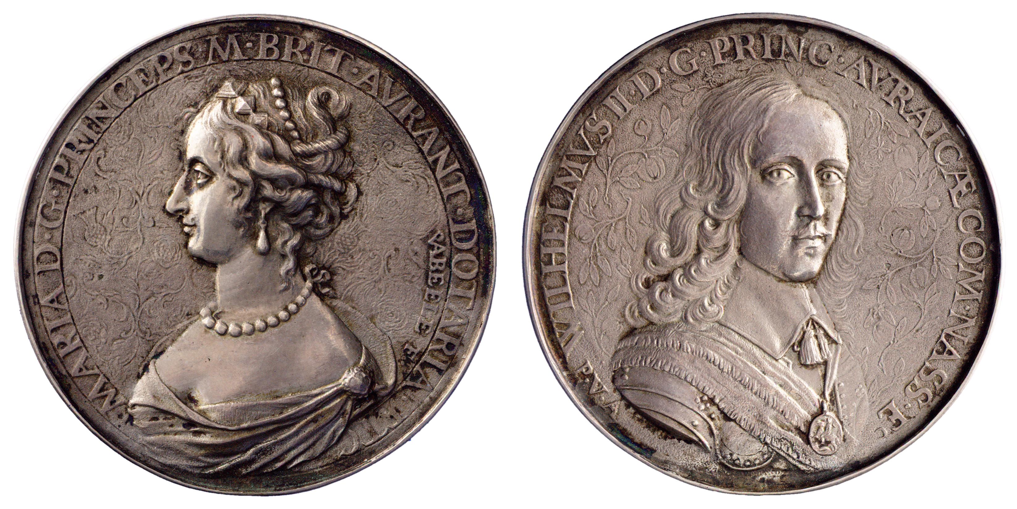 keerzijde: een omschrift waarbinnen de buste naar links van Maria Henriëtte Stuart met parelsnoer om de hals en in het haar; ze is omgeven door bloemmotieven.