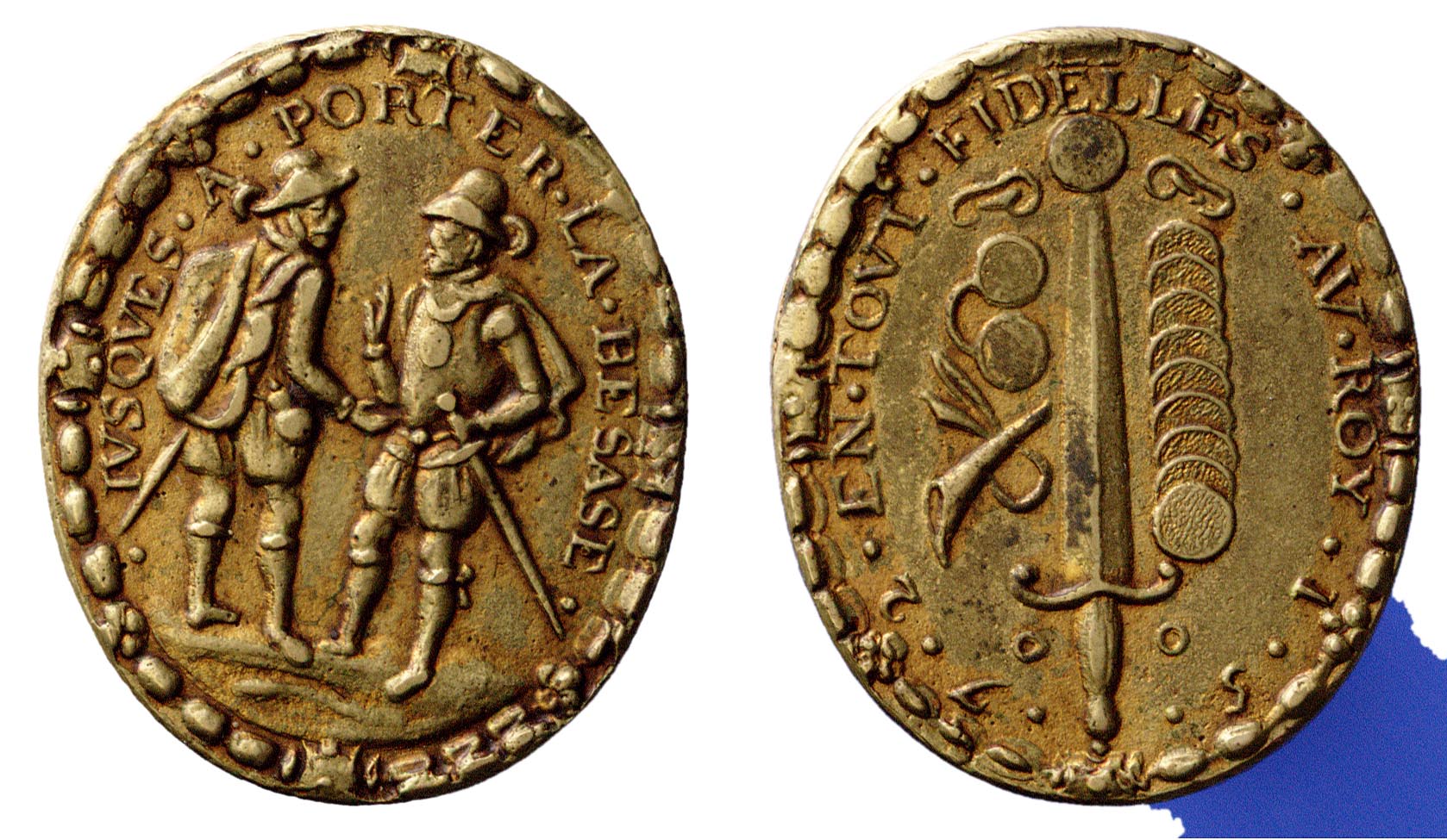 voorzijde: een omschrift waarbinnen een rechtopstaand zwaard met een penning op de punt. Twee oren links en rechts van de punt. Links van het zwaard staan een bril en een fluit afgebeeld; rechts 9 dukaten half over elkaar heen in een rij.