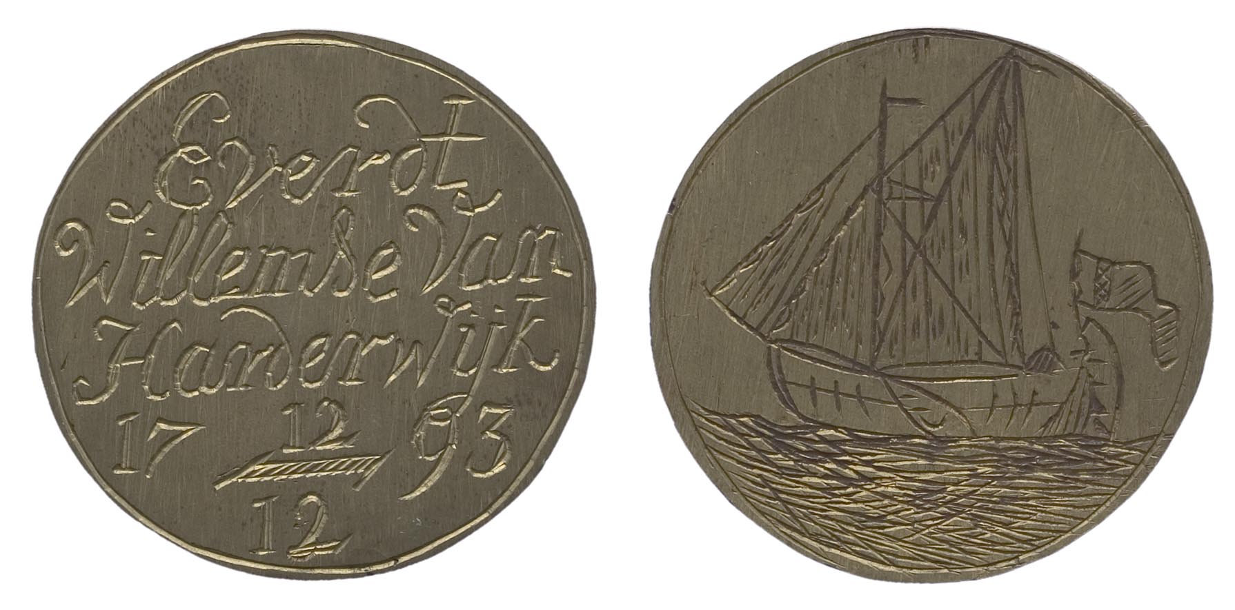 voorzijde: binnen een cirkelgroef een zeilbootje met éénmast en een zijzwaard, varend naar links, vlag naar rechts. keerzijde: binnen een cirkelgroef een signatuur.