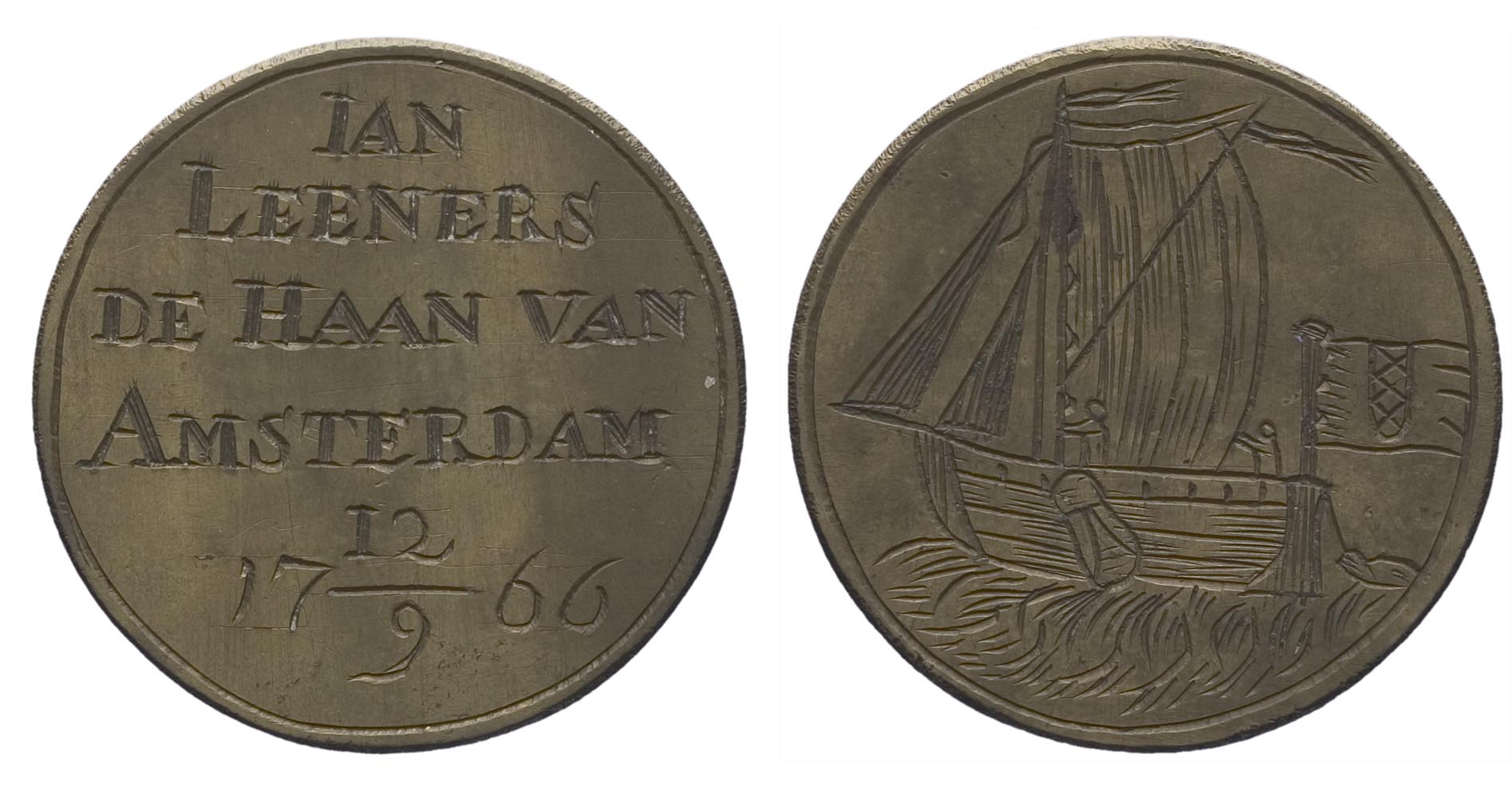 voorzijde: binnen een cirkelgroef een zeilbootje met één mast en een zijzwaard, met twee personen aan boord, varend naar links, wimpels en de vlag met het wapen van Amsterdam waaiend naar rechts.