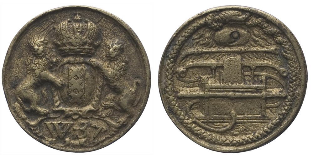 voorzijde: het gekroonde wapen van Amsterdam, gehouden door twee leeuwen. Onder het wapen een veld met W.37 Achter de kroon een stralende zon.