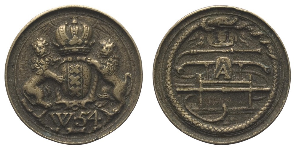 voorzijde: het gekroonde wapen van Amsterdam, gehouden door twee leeuwen. Onder het wapen een veld met W.54 Achter de kroon een stralende zon.