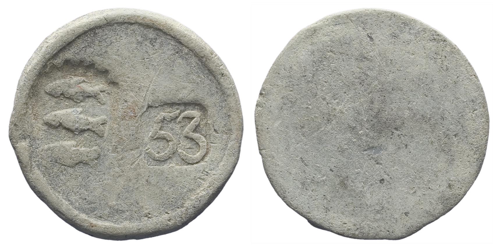 Eénzijdig loodje met het ingeslagen wapen van Enkhuizen (de drie haringen boven elkaar) en rechts een nummer.- Trefwoorden