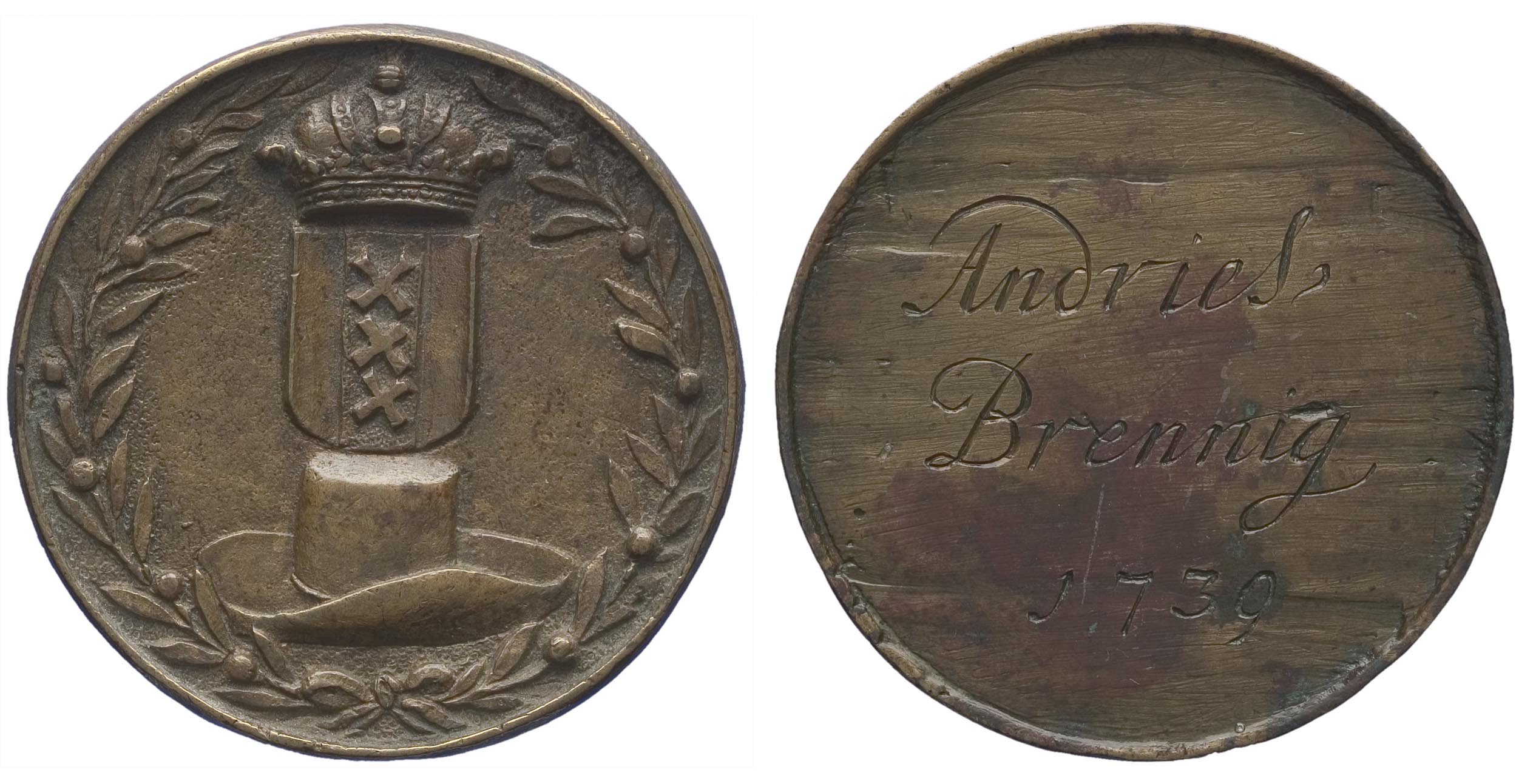 voorzijde: een platte hoed, waarboven het gekroonde wapen van Amsterdam. Het geheel omgeven door een lauwerkrans. keerzijde: een signatuur en jaartal gegraveerd.- Trefwoorden