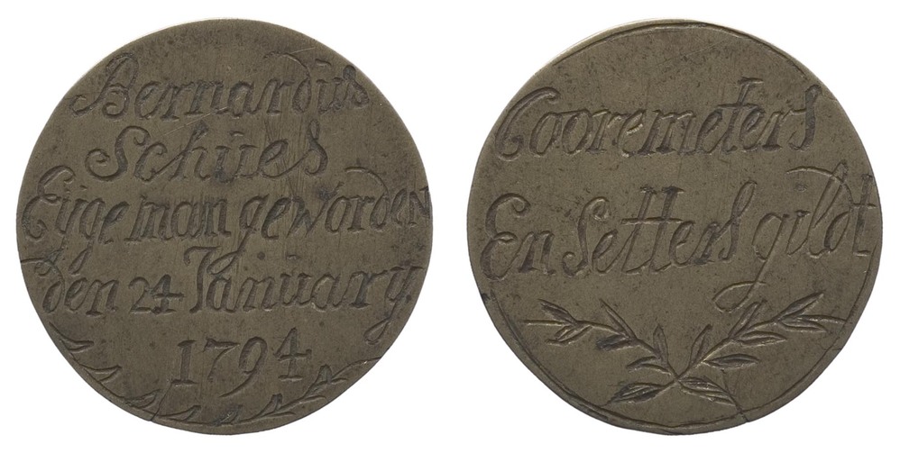 Korenmeters- en korenzettersgilde t.n.v. Bernardus Schues Eijgeman geworden den 24 january 1794, 1794 koper, metaal hoogte: 3.4 cm; breedte: 3.4 cm; diepte: 0.2 cm; opschrift voorzijde: Cooremeters / En Setters gildt