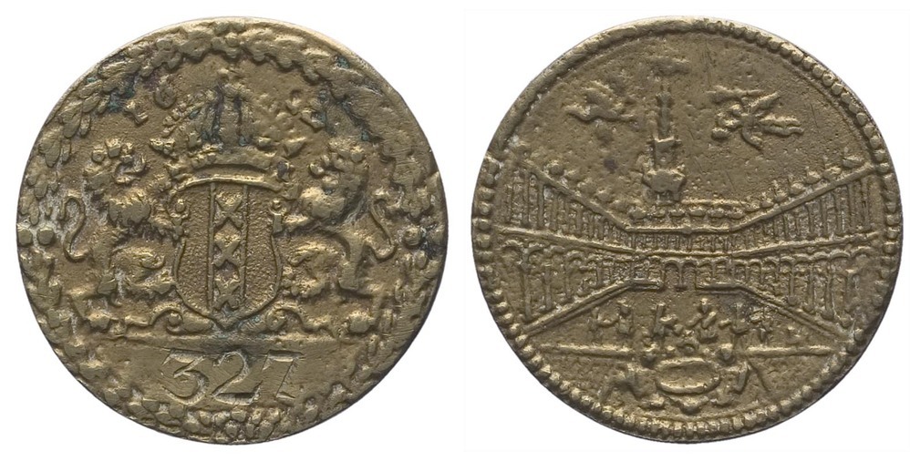 voorzijde: gekroond wapenschild van Amsterdam, geflankeerd door twee leeuwen onder jaartal; onder de afsnede het cijfer 327. De rand is voorzien van een palmkrans.