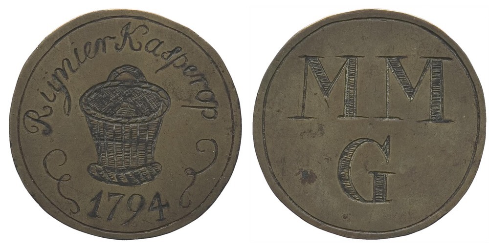 voorzijde: binnen een cirkelgroef een mand en inscriptie met jaartal. keerzijde: binnen een cirkelgroef de letters MMG.- Trefwoorden
