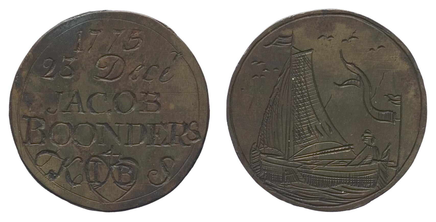 voorzijde: binnen een cirkelgroef een zeilscheepje met vlaggetje en wimpels naar links; een schipper bij het roer; in de lucht zes vogels.