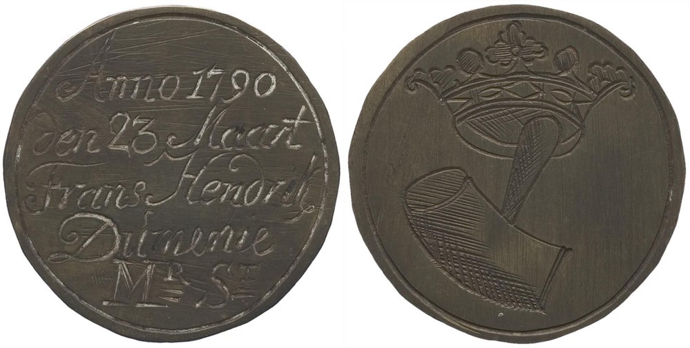 voorzijde: een gekroonde omlaag hangende steenhouwershamer. Cirkelgroef. keerzijde: signatuur en datering gegeraveerd. Cirkelgroef.