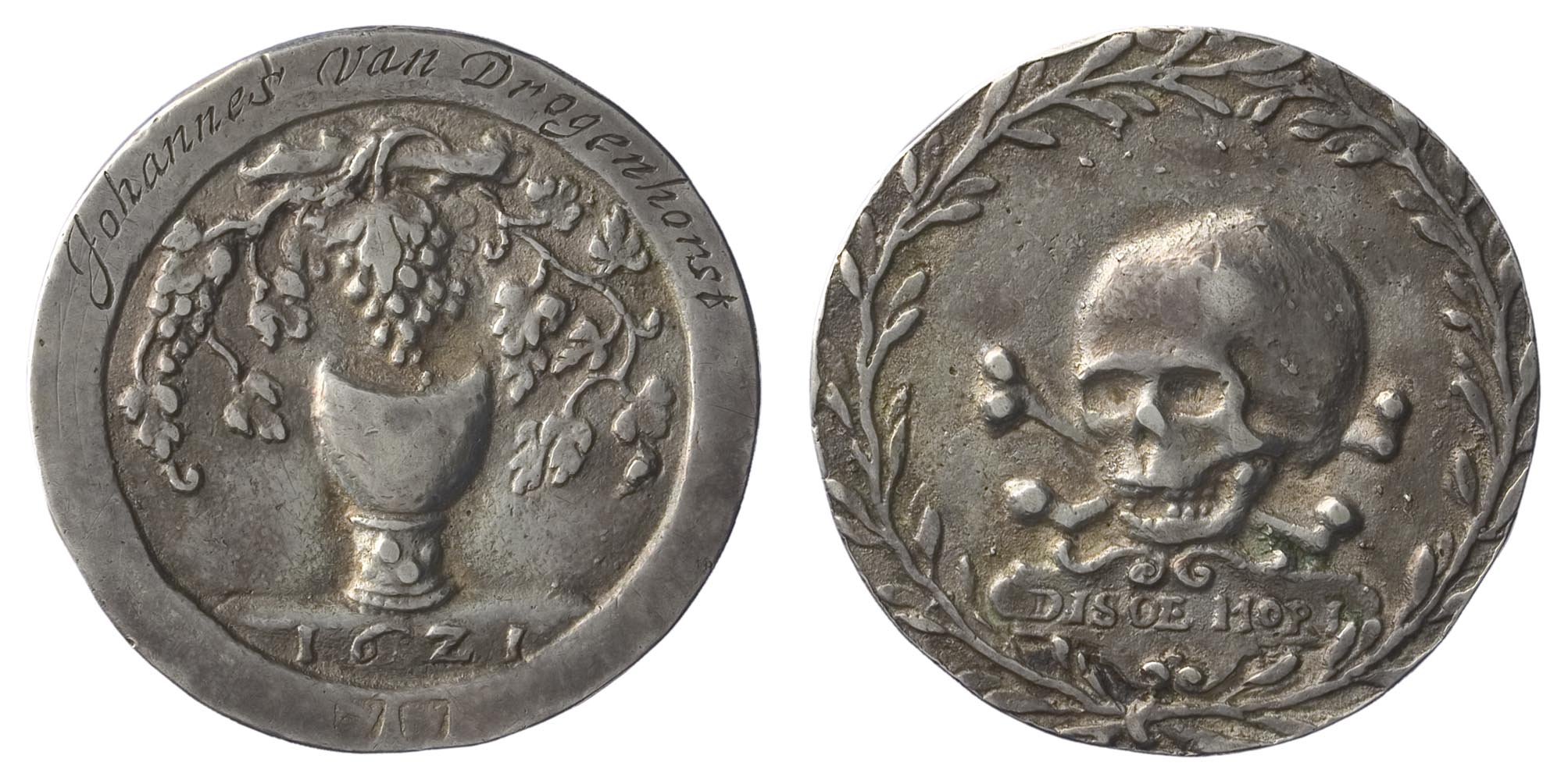 voorzijde: omgeven door een bladerkrans een doodshoofd waarachter kruislings twee beenderen. Daaronder op een schild met de tekst: DISCE MORI