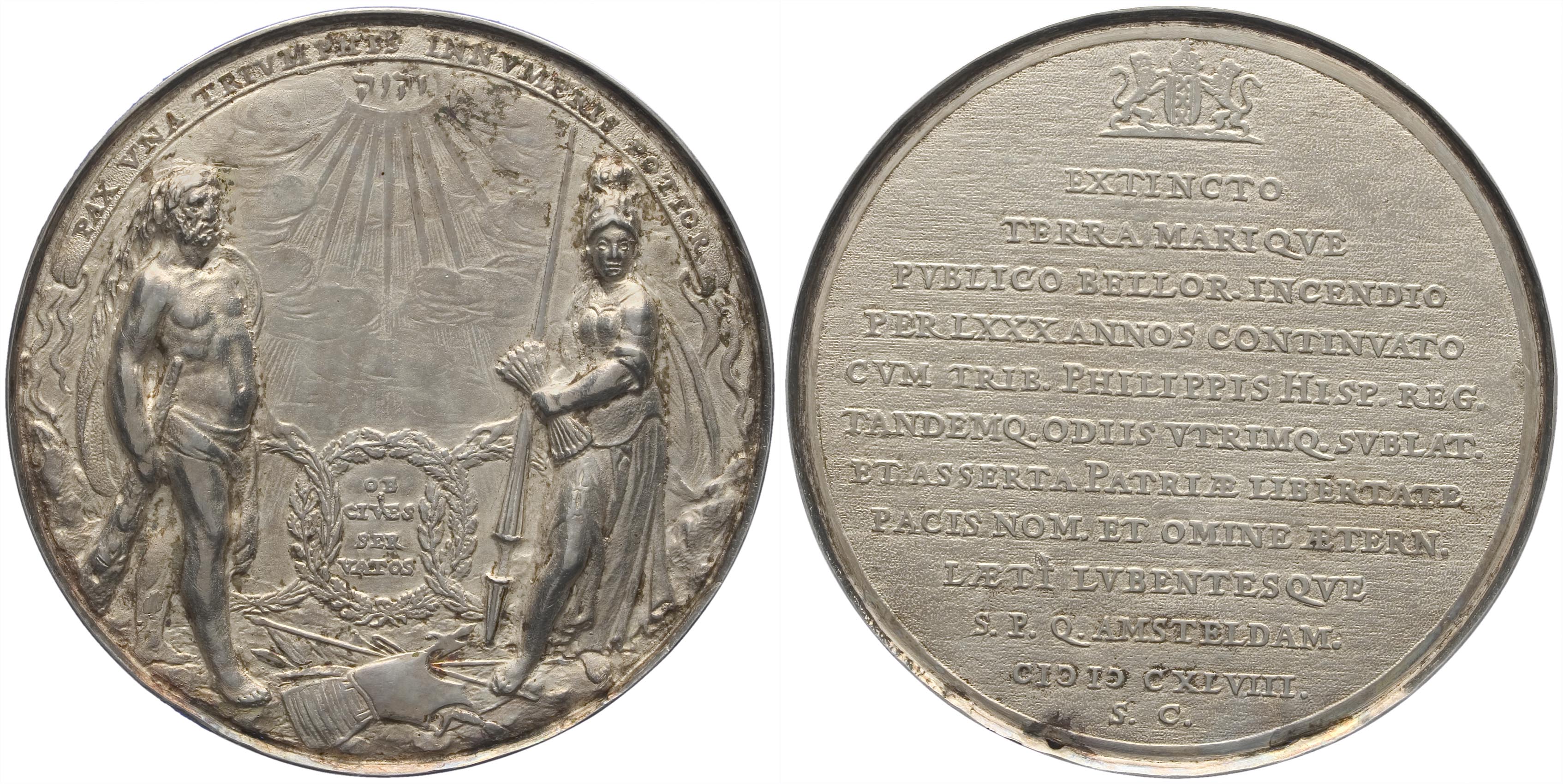 opschrift keerzijde: EXTINCTO / TERRA MARIQVE / PVBLICO BELLOR INCENDIO / PER LXXX ANNOS CONTINVATO / COM TRIB PHILIPPIS HISP . REG . / TANDEMQ . ODIIS VIRIMQ . SVBLAT . / ET ASSERTA PATRIAE LIBERTATE / PACIS NOM . ET OMINE AETERN . / LAETI LVBENTESQVE / S . P . Q . AMSTELDAM . M D CXLVIII . / S . C .