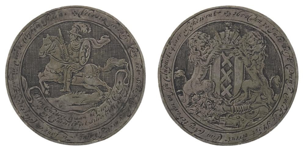 Op de voorzijde ligt onder het gekroonde Amsterdamse wapen een soldaat met gebroken wapens. Zoals het het omschrift meldt staat op deze penning de aanval zelf centraal: ‘1650 den 30 Juli heeft Prinse volck de stadt berent Van Amsterdam en sijn Augusti 4 daer afghewent’. In tegenstelling tot wat deze penningen misschien doen vermoeden, hadden de schutters nauwelijks strijd hoeven leveren. Slechts eenmaal schoten ze met scherp, maar dat was omdat zij meenden hoefgetrappel te horen. ( Judith van Gent)