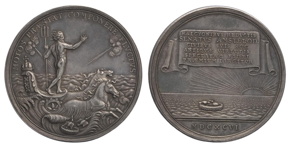 Beeld voorzijde: Neptunus staat, met drietand in de linkerhand, in een strijdwagen. Achter op de wagen kroon en wapen van Amsterdam. Op de wilde zee twee vogels in een nest. Winden blazen in de vorm van mensenhoofden.