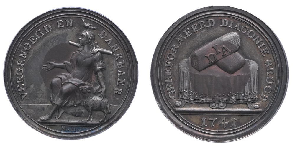 keerzijde: een tafel met gedrapeerd tafelkleed, daarop twee gekruiste broden waarop de letters DIA. Omschrift. Onder de afsnede een jaartal.