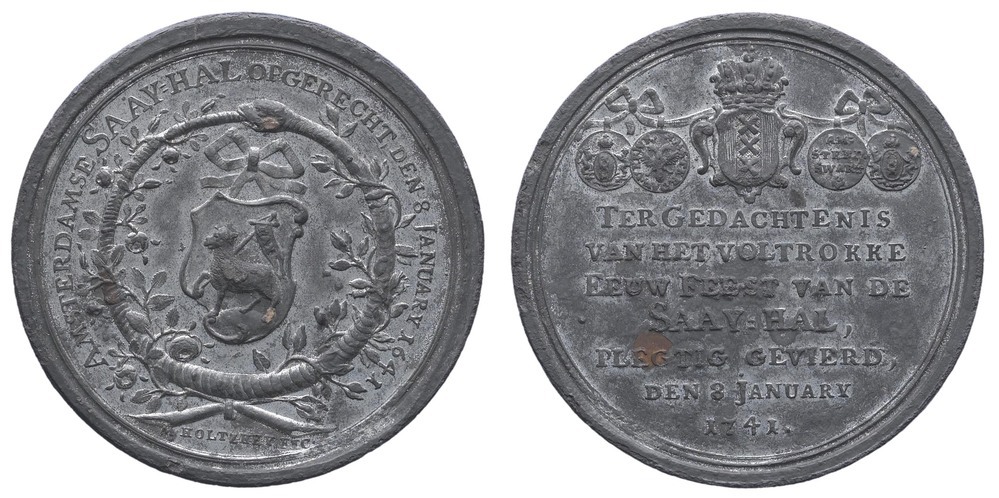opschrift keerzijde: TER GEDACHTENIS / VAN HET VOLTROKKE / EEUW FEEST VAN DE / SAAY-HAL, / PLEGTIG GEVIERD, / DEN 8 JANUARY / 1741.