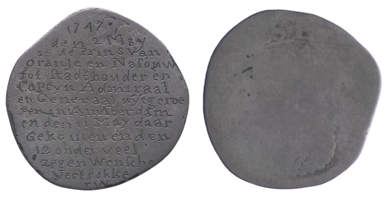 opschrift voorzijde: 1747 / den 2 May / is de Prins Van / Oranje en Nasauw / tot Stadthouder en / Captyn Admiraal / en Generaal úytgeroe / pen in Amsterdam / en den 11 May daar / Gekomen en den / 12 onder veel / zegen Wensche / Vertrokken / J.W.