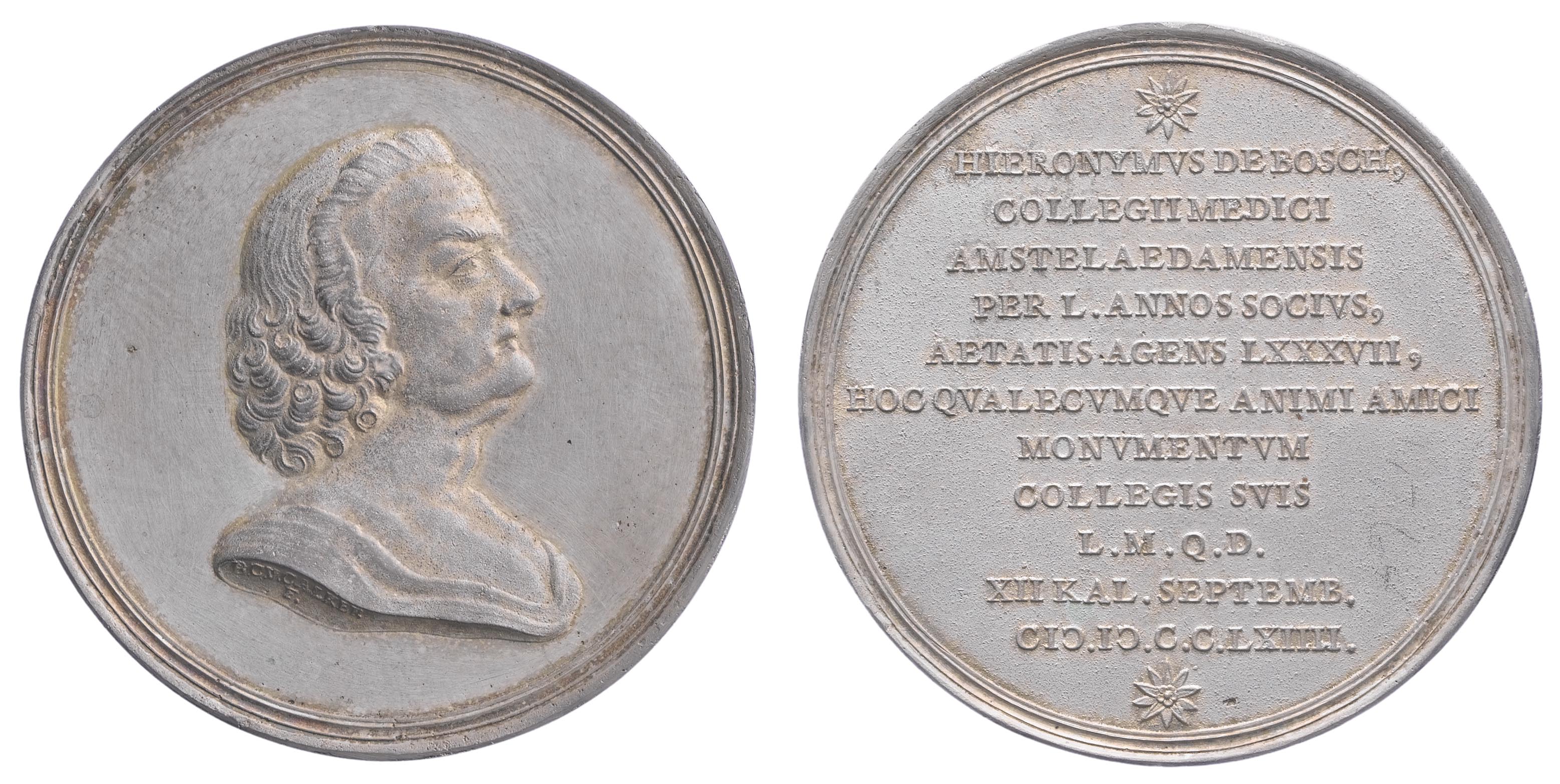 opschrift keerzijde: HIERONYMVS DE BOSCH, / COLLEGII MEDICI /AMSTELAEDAMENSIS / PER L. ANNOS SOCIVS, / AETATIS AGENS LXXXVII, / HOC QVALECVMQVE ANIMI AMICI / MONVMENTVM / COLLEGIS SVIS / L.M.Q.D. / XII KAL. SEPTEMB. / CIC.IC.C.C.LXIIII.