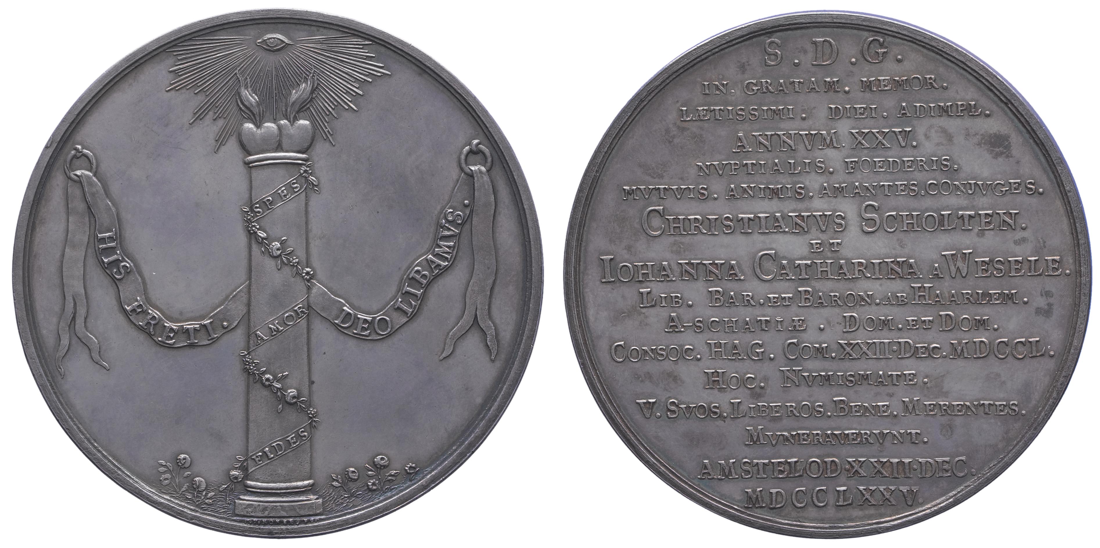 opschrift keerzijde: S.G.D. / IN. GRATAM. MEMOR. / LETISSIMI. DIEI. ADIMPL. / ANNVM. XXV. / NVPTIALIS. FOEDERIS, / MVTVIS, ANIMIS, AMANTES, CONJVGES. / CHRISTIANVS SCHOLTEN. / ET / IOHANNA CATHARINA A WESELE. / LIB. BAR. ET BARON. AE HAARLEM. / A-SCHATIÆ . DOM. ET DOM. / CONSOC. HAG. COM. XXII.DEC. MDCCL. / HOC. NVMISMATE. / V. SVOS. LIBEROS. BENE. MERENTES. / MVNERAVERVNT. / AMSTELOD. XXII. DEC. / MDCCLXXV.