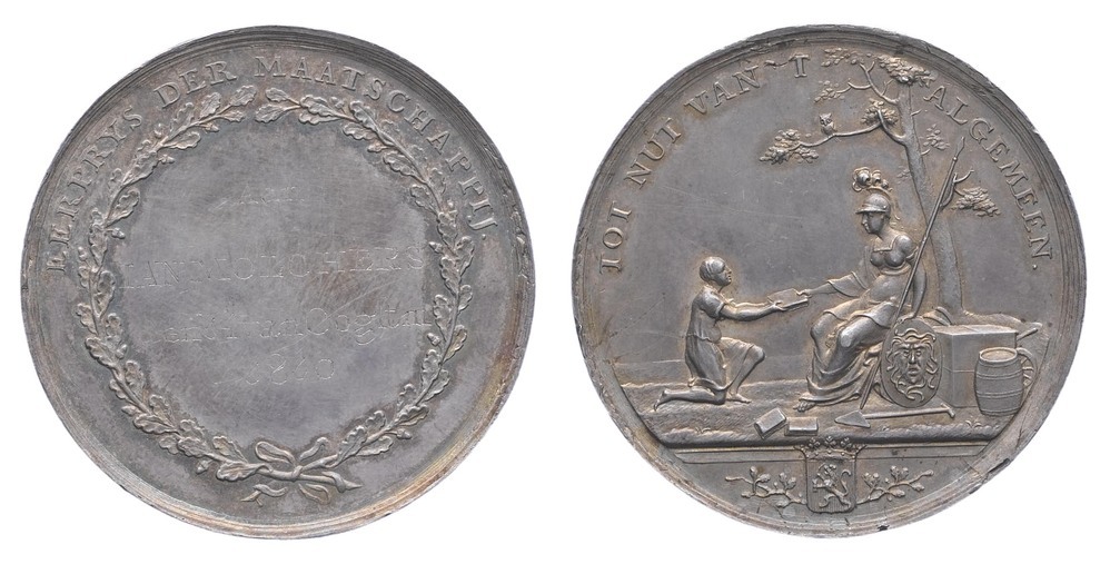 voorzijde: een omschrift waarbinnen Minerva, gezeten naar links voor een boom, naast een speer en een schild met Medusakop, geeft een boek aan een vrouw. Rechts bij de boom een ton en wagenwiel, op de voorgrond een spade en twee boeken. In de afsnede het gekroonde wapen van de Generaliteit met een lauwertak.