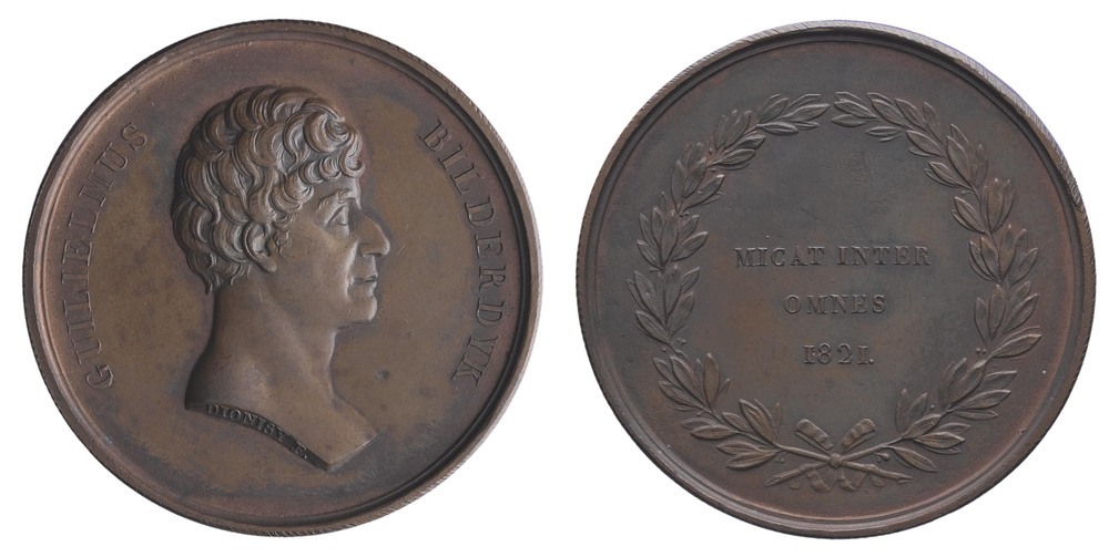 voorzijde: in een omschrift het borstbeeld en profil naar rechts van W. Bilderdijk, met een signatuur onder de hals.