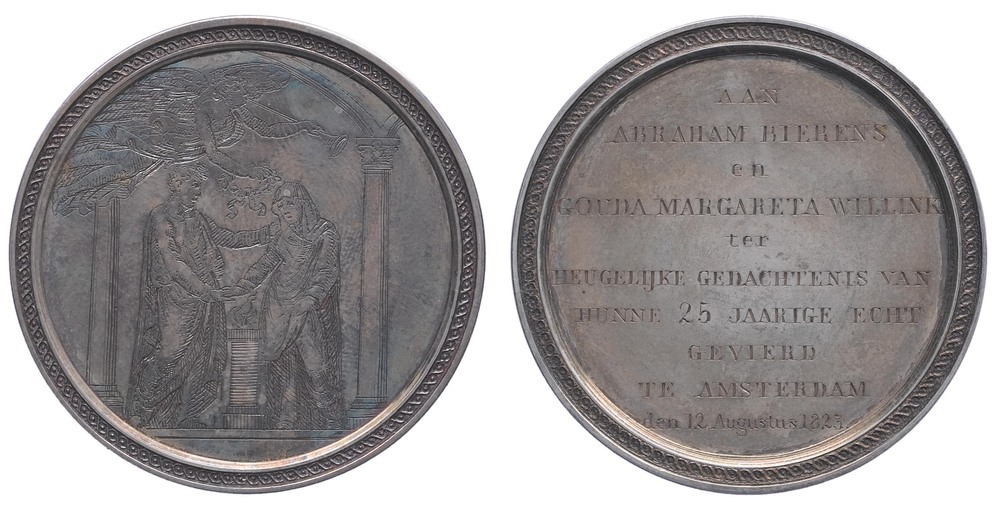 opschrift keerzijde: aan / Abraham Bierens / en / Gouda Margareta Willink / ter / heugelijke gedachtenis van / hunne 25 jaarige echt / gevierd / te Amsterdam / den 12 Augustus 1823