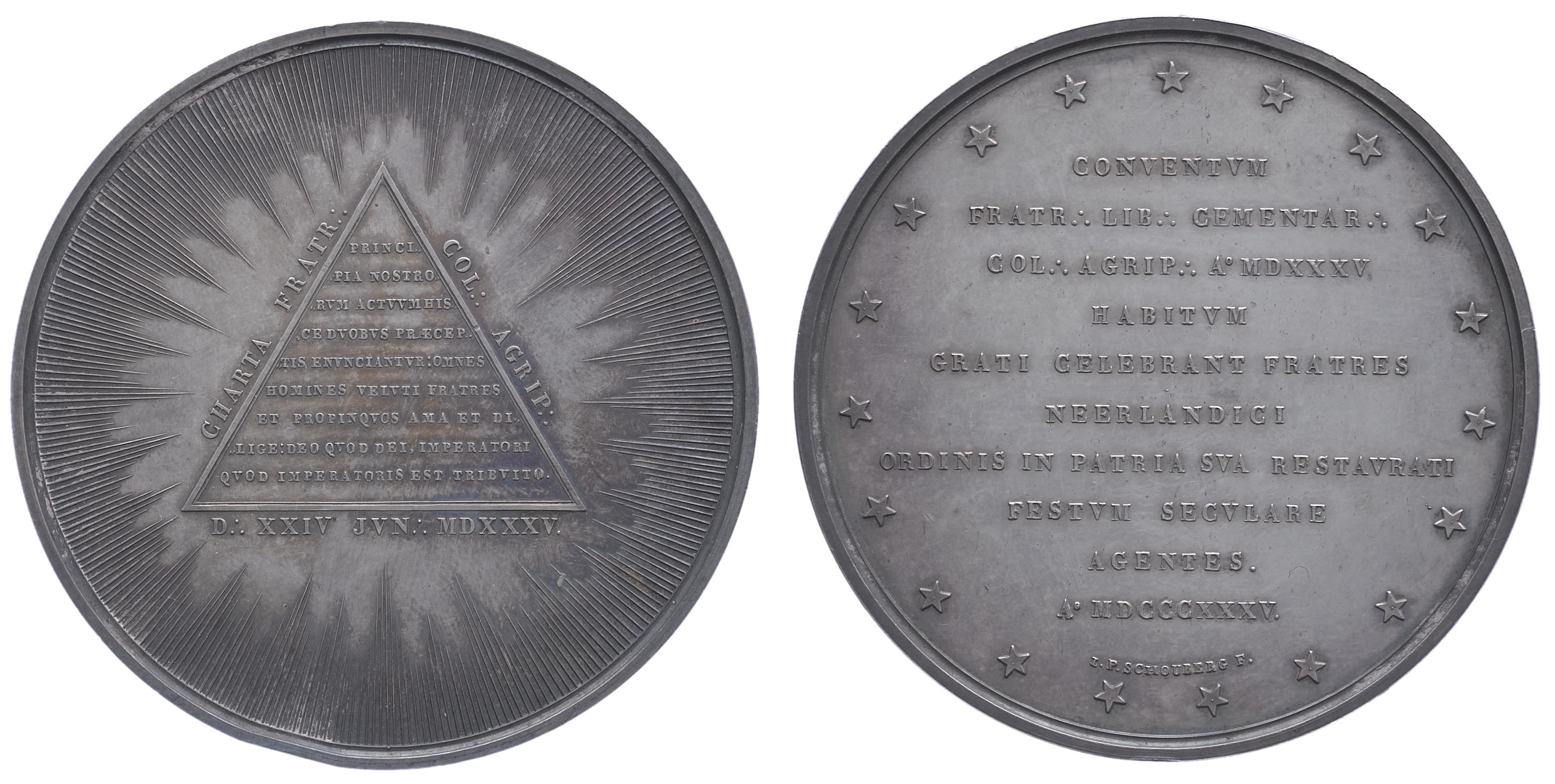 opschrift keerzijde: CANVANTVM / FRATR.: LIB.: CEMENTAR.: / COL.: AGRIP.: Aº. MPXXXV / HABITVM / GRATI CEEBRANT FRATRES / NEERLANDICI / ORDINIS IN PATRIA SVA RESTAVRATI / FESTVM SECVLARE / AGENTES. / Aº. MDCCCXXXV.