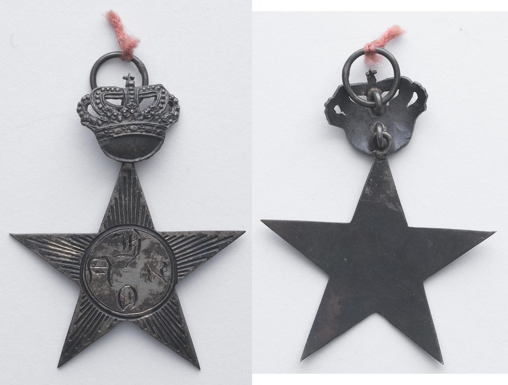 voorzijde: een opschrift in een cirkel waaraan een vijfpuntige ster met een kroon bovenop de bovenste sterpunt. Aan de kroon een oog met ring. Op de sterpunten zijn stralen gegraveerd. keerzijde is onbewerkt.