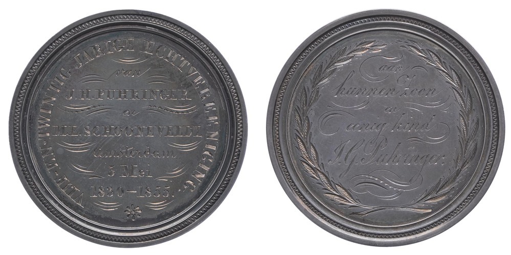 opschrift voorzijde: van / J.H.PUHRINGER / en / M.E.SCHOONEVELDT / amsterdam / 3 Mei / 1830 - 1855.