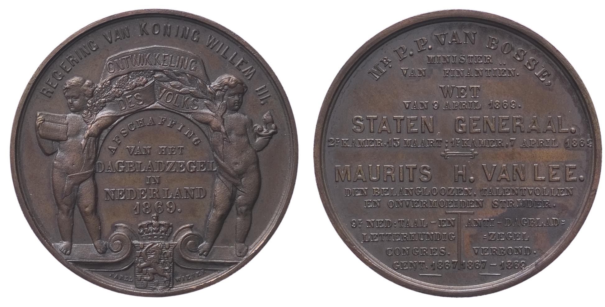 opschrift keerzijde: MR. P.P. VAN BOSSE, / MINISTER / VAN FINANTIËN. / WET / VAN 9 APRIL 1869. / STATEN GENERAAL. / 2E KAMER, 13 MAART; 1E KAMER, 7 APRIL 1869 / MAURITS H. VAN LEE. / DEN BELANGLOOZEN, TALENTVOLLEN / EN ONVERMOEIDEN STRIJDER. / 9E. NED:TAAL - EN / LETTERKUNDIG / CONGRES. / GENT. 1867 / ANTI-DAGBLAD= / ZEGEL / VERBOND. 1867-1869