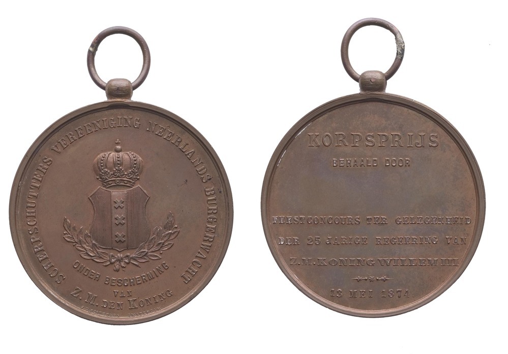 opschrift keerzijde: KORPSPRIJS / BEHAALD DOOR / FEESTCONCOURS TER GELEGENHEID / DER 25 JARIGE REGERING VAN / Z.M. KONING WILLEM III / 13 MEI 1874.