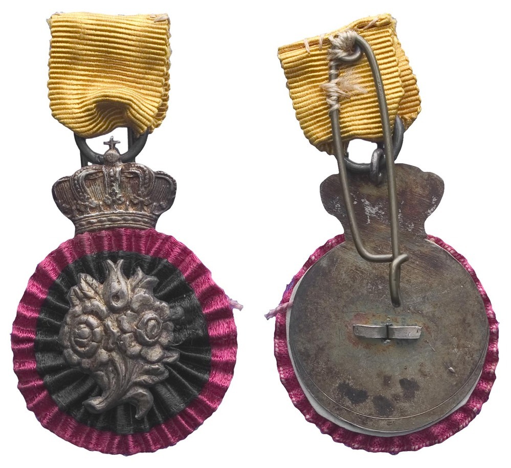 voorzijde: een bouquet bloemen in reliëf over een rond geplooid rozet van stof, zwart met paarse rand, vastgepind op een metalen ondergrond met bovenaan een koningskroon, met kleine ring, waaraan een grotere ring met goudkleurig riblint met speld. keerzijde is onbewerkt.- Trefwoorden