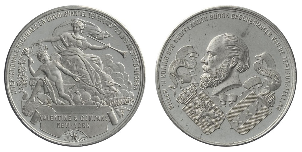 omschrift keerzijde: INTERNATIONAL KOLONIALE EN UITVOERHANDEL TENTOONSTELLING AMSTERDAM 1883