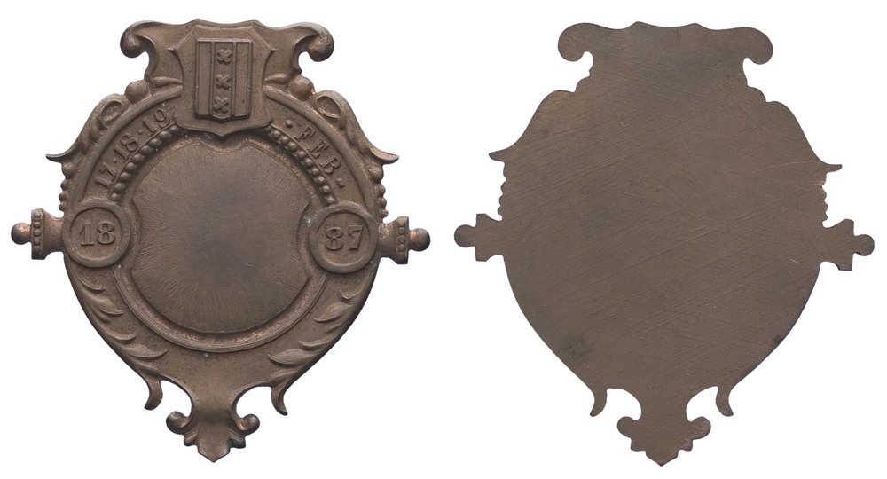 voorzijde: een leeg bijna rond veld omgeven door enkele ornamenten met bovenin het stadswapen van Amsterdam. In een cirkel links en rechts het jaartal 18 / 87 met daarboven in een omschrift 17-18-19 / .Feb - keerzijde is onbewerkt.