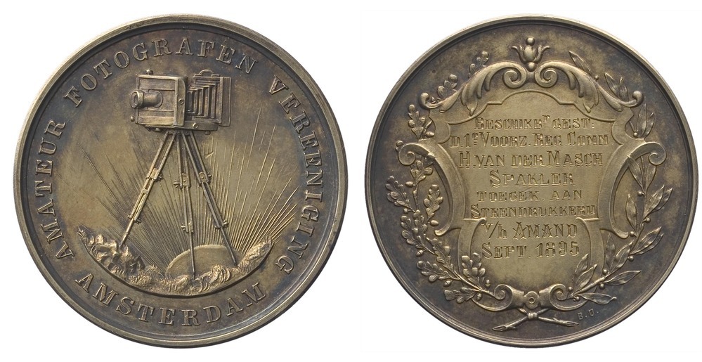 voorzijde: in een omschrift een fototoestel op een driepoot statief. Daarachter opkomende zon met zonnestralen.