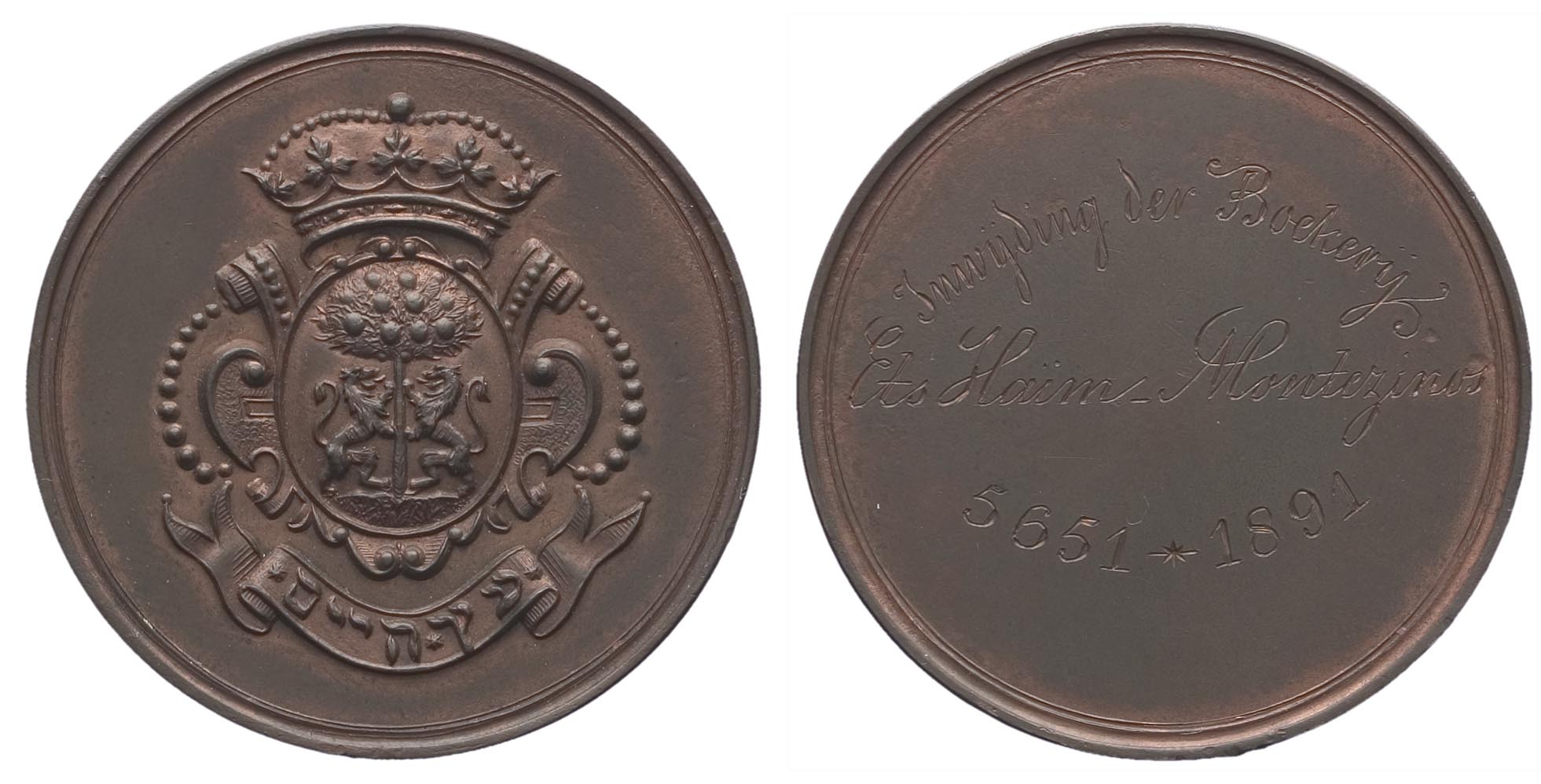 opschrift keerzijde: Inwijding der Boekerij / Ets Haïm Montezinos / 5651 * 1891