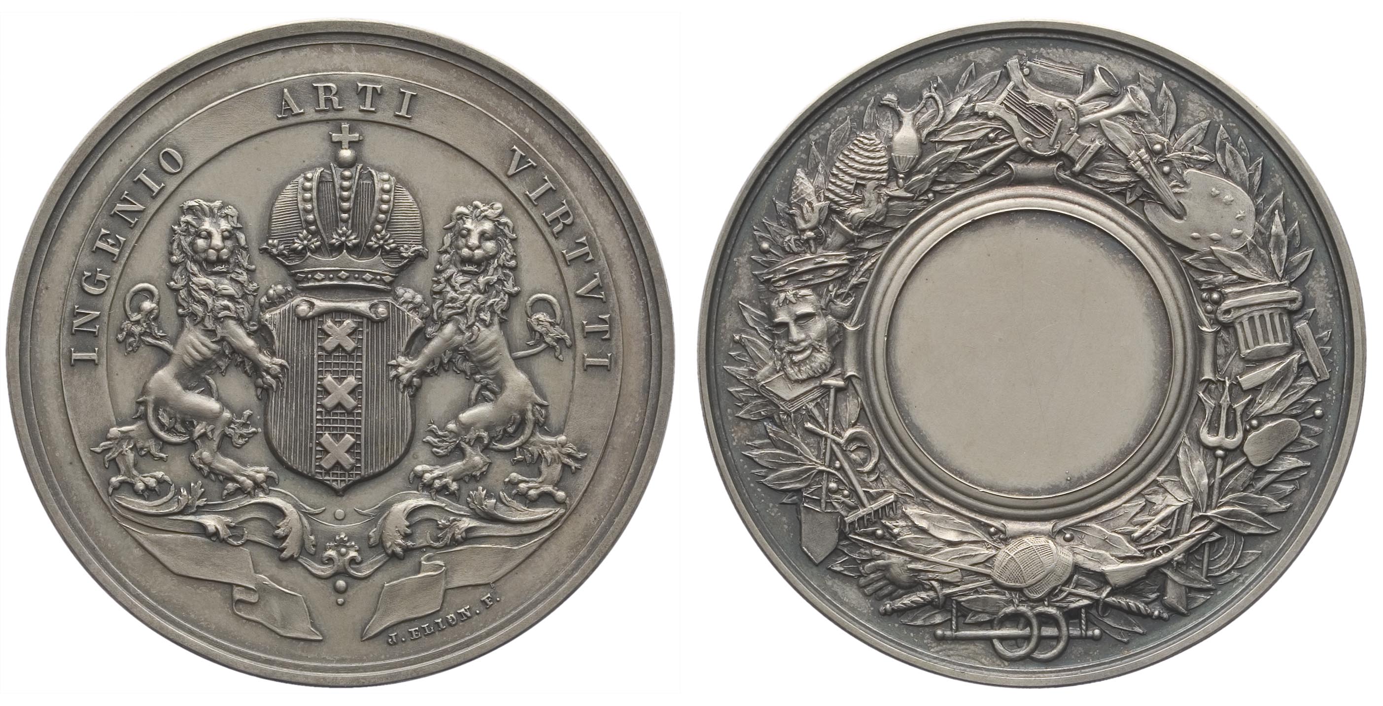 voorzijde: het gekroonde stadswapen van Amsterdam gehouden door twee leeuwen omgeven door een lint met opschrift. Onderaan een signatuur.
