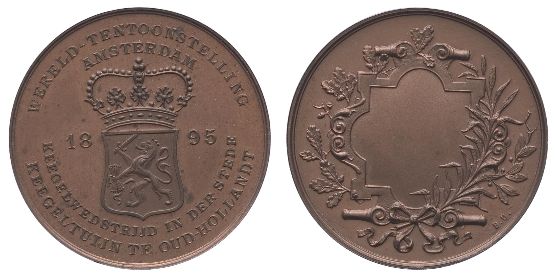 omschrift voorzijde: WERELD-TENTOONSTELLING KEEGELTUIJN TE OUD-HOLLAND / KEEGELWEDSTRIJD IN DER STEEDE AMSTERDAM / 1895