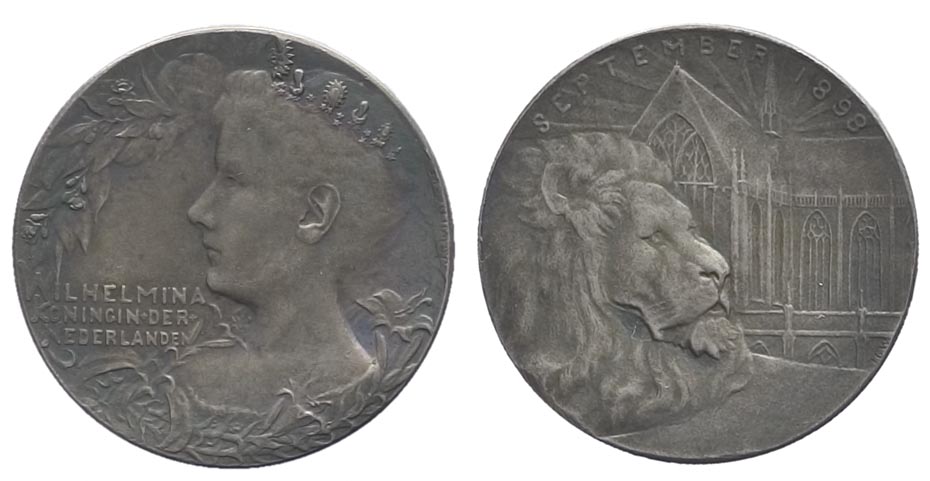 voorzijde: omgeven door lelietakken, als beeld der onschuld, in de rechterhelft van het veld het linksgewend borstbeeld in profiel van h.m. de koningin Wilhelmina met ontblote hals, met een diadeem op haar hoofd. Links van haar een opschrift.