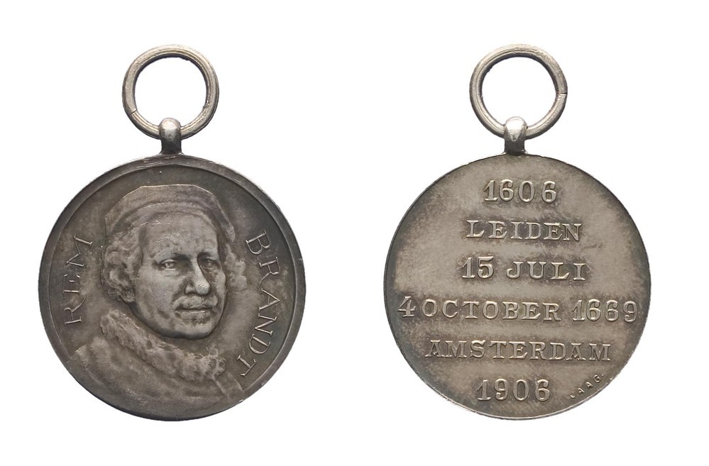 opschrift keerzijde: 1606 / LEIDEN / 15 JULI / 4 OCTOBER 1669 / AMSTERDAM / 1906
