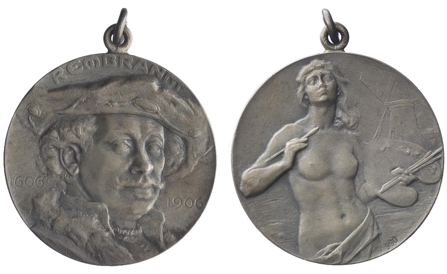voorzijde: portret van Rembrandt schuin naar rechts met baret. Opschrift. Bovenaan een oog met ring. keerzijde: een halfnaakte vrouw met penseel in de rechterhand en een palet met penselen in de linkerhand. Rechts een molen.