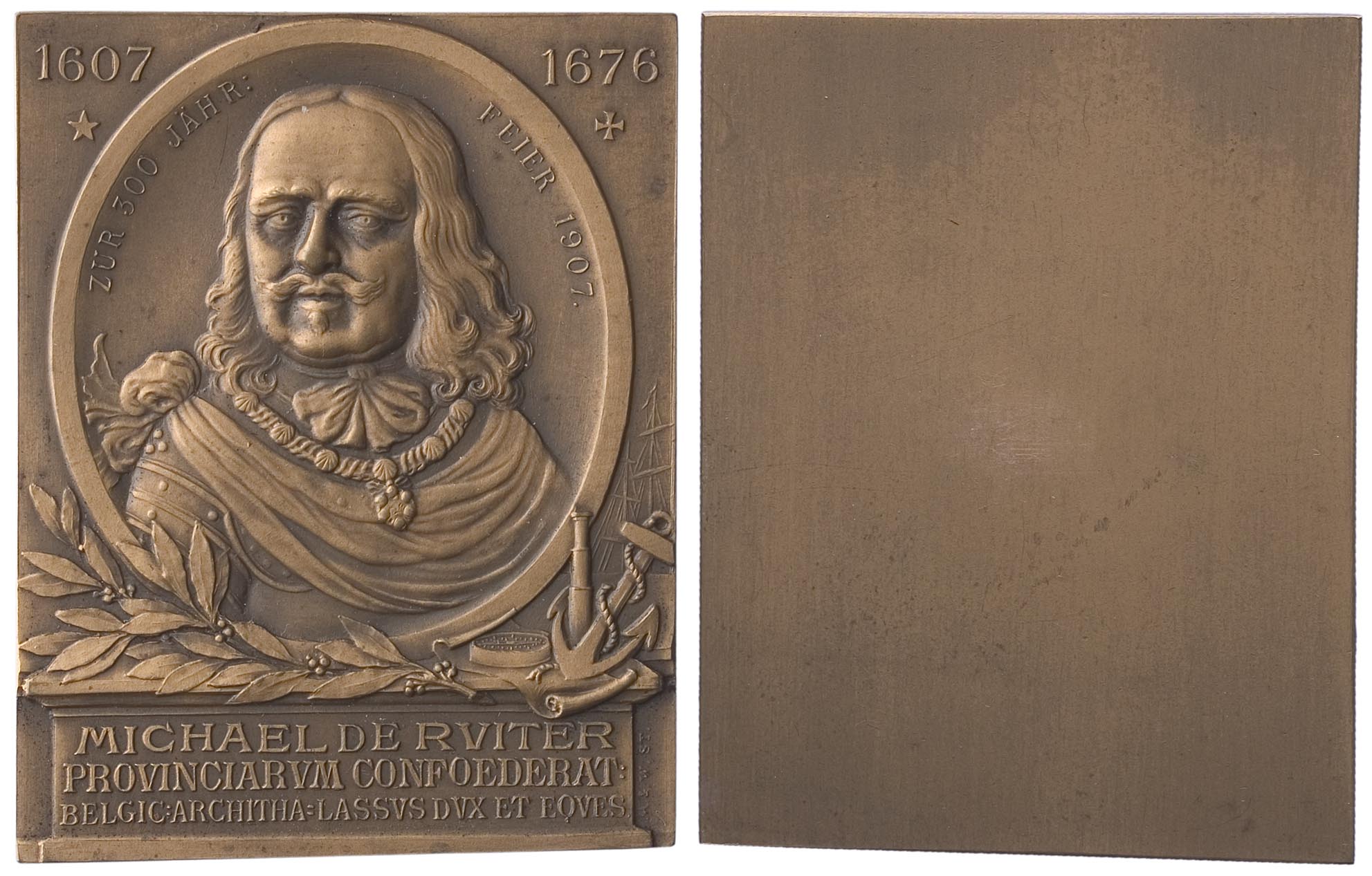 voorzijde: het geharnaste borstbeeld van M.A. de Ruyter in een ovaal met omschrift in Duits. Bovenaan twee jaartallen. Onderaan een opschrift in een cartouche waarop een lauwertak, een anker een getuigd schip, een verrekijker, een kompas, een zeekaart en een touw. Rechtsonder een signatuur.