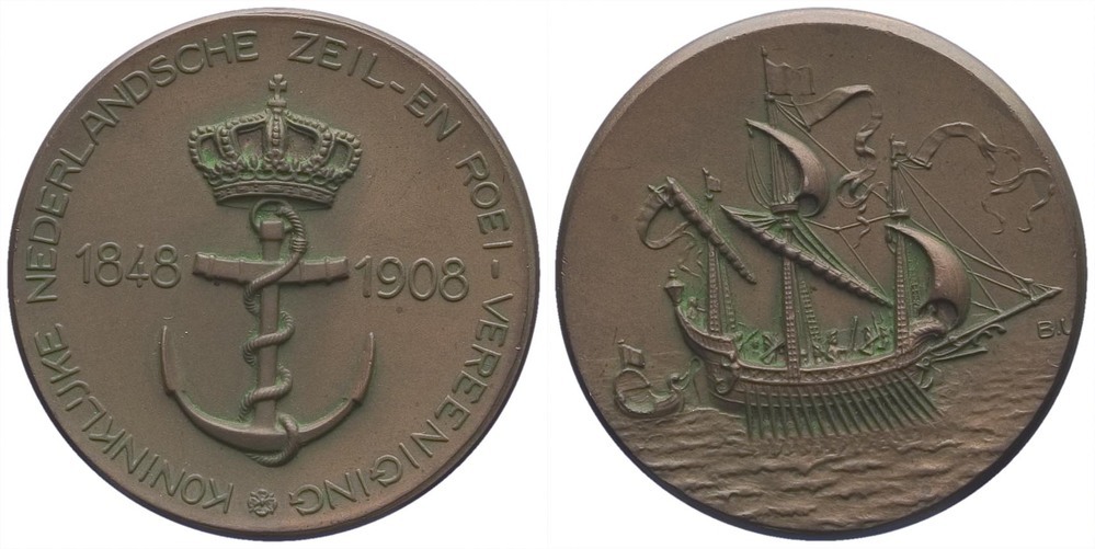 keerzijde: een galei naar rechts op het water met roeiers, roeispanen en twee gehesen fokzeilen, drie masten met vlag en wimpels. Links achter de galei een roeibootje. Rechts een signatuur.
