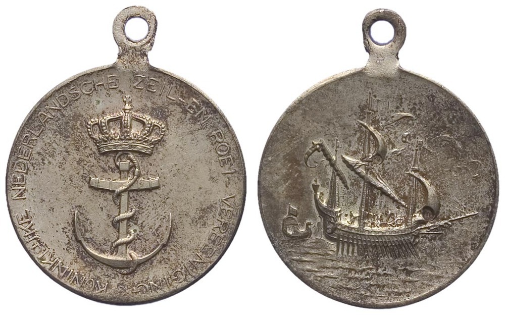 keerzijde: een galei naar rechts op het water met roeiers, roeispanen en twee gehesen fokzeilen, drie masten met vlag en wimpels. Links achter de galei een roeibootje. Rechts een signatuur.