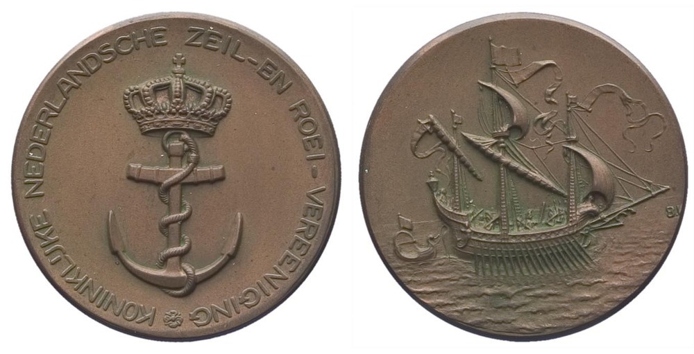 keerzijde: een galei naar rechts op het water met roeiers, roeispanen en twee gehesen fokzeilen, drie masten met vlag en wimpels. Links achter de galei een roeibootje. Rechts een signatuur.