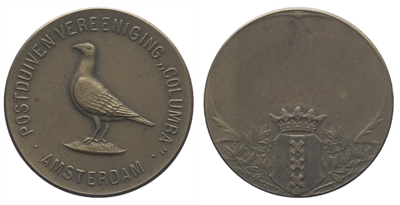 voorzijde: in een omschrift een staande postduif naar links. keerzijde: onder een leeg veld het gekroonde wapen van Amsterdam omgeven door lauwertakken. Onderaan een monogram.